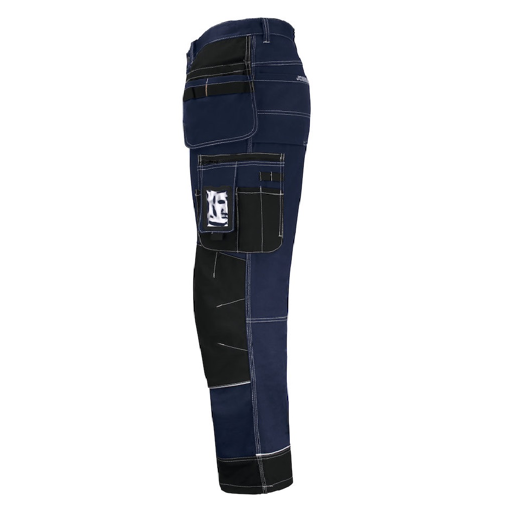 Grandes poches étuis qui peuvent être rentrées dans les poches avant. Poches arrière renforcées à l’intérieur. Anneau pour marteau. Anneaux supplémentaires sur les grandes tailles. Poche mètre et porte-couteau avec bouton. Poche jambe avec fermeture éclair, poche téléphone et poche porte badge. Genoux préformés pour un meilleur confort. Poches genouillères en Cordura avec bandes réfléchissantes et réglables sur deux positions. Renforts aux chevilles en polyamide imperméable. Conforme à la norme EN 14404 :2004+A1 :2010 Type 2 Niveau 1 avec les genouillères Jobman 9943, 9944 et 9945.